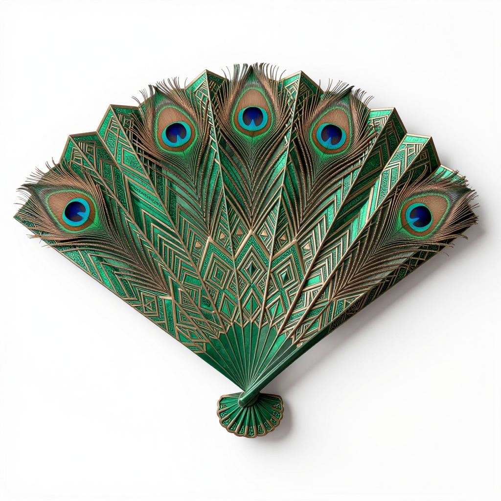 An exquisite illustration of Art Deco peacock feather fan, crafted in geometric symmetrical pattern with emerald green and bronze highlights, set against a vast white negative space, UHD, 16K, ultra-detailed.
