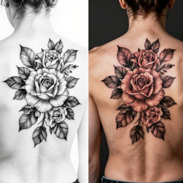 Photograph of a tattoo on a person's back, split into two vertical panels. The left panel shows a black-and-white sketch of a detailed, realistic floral design with large roses and leaves. The right panel displays the same tattoo in full color, with the roses shaded in a gradient of pink and red, and the leaves in black and gray, emphasizing depth and texture. The person has light skin and is viewed from the back, with the tattoo centered on their upper back. The background is dark and out of focus.