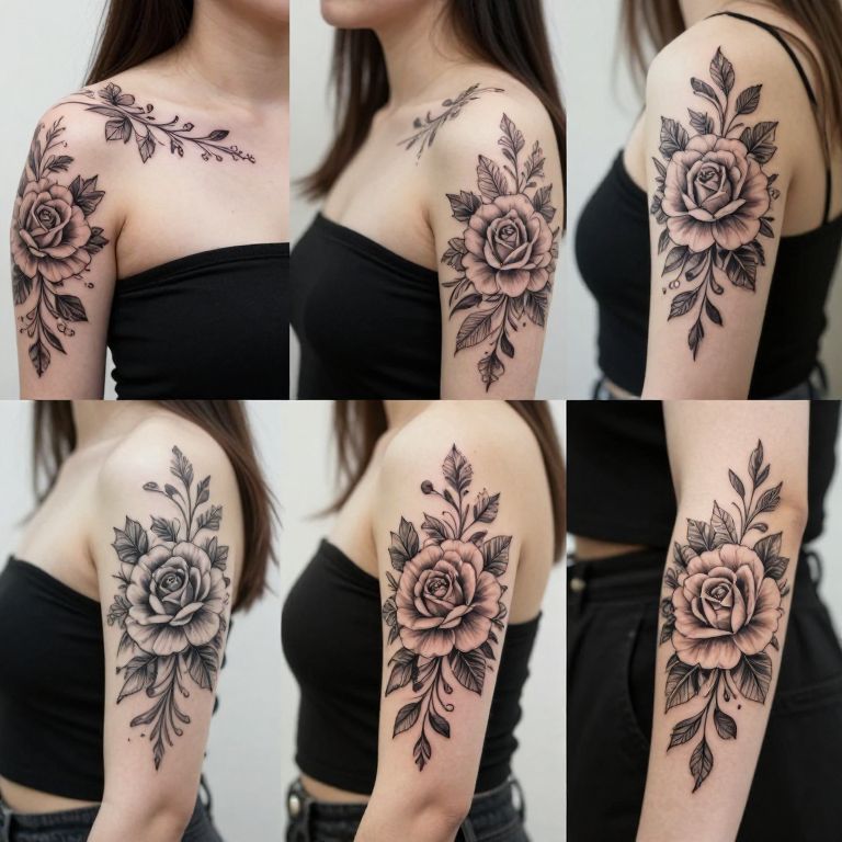 Black-and-white tattoo design of a detailed rose with leaves on the back, shown in a sketch and colored version.
