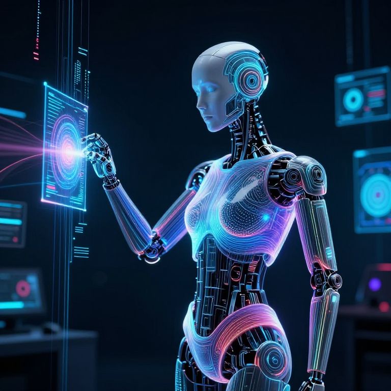 CGI image of a glowing, futuristic, female humanoid robot with neon blue and pink lights, interacting with a holographic interface in a dark, tech