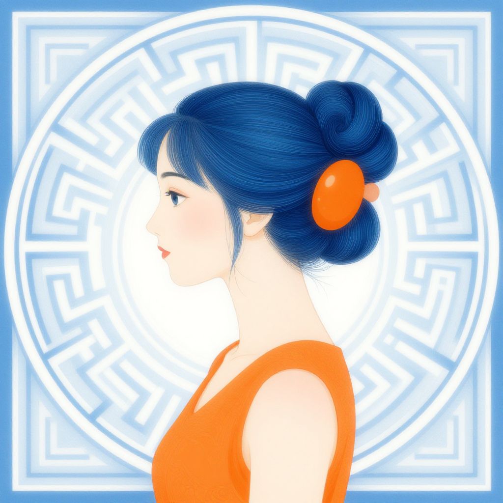 Illustration of an elegant woman's profile with blue-toned hair styled in a bun, adorned with an orange circular hair accessory. The background features a complex circular labyrinth pattern in soft blue and white, creating a visually striking contrast. The woman wears a sleeveless orange dress, and the overall artwork combines smooth lines and intricate details inspired by MC Escher and traditional Japanese art influences.