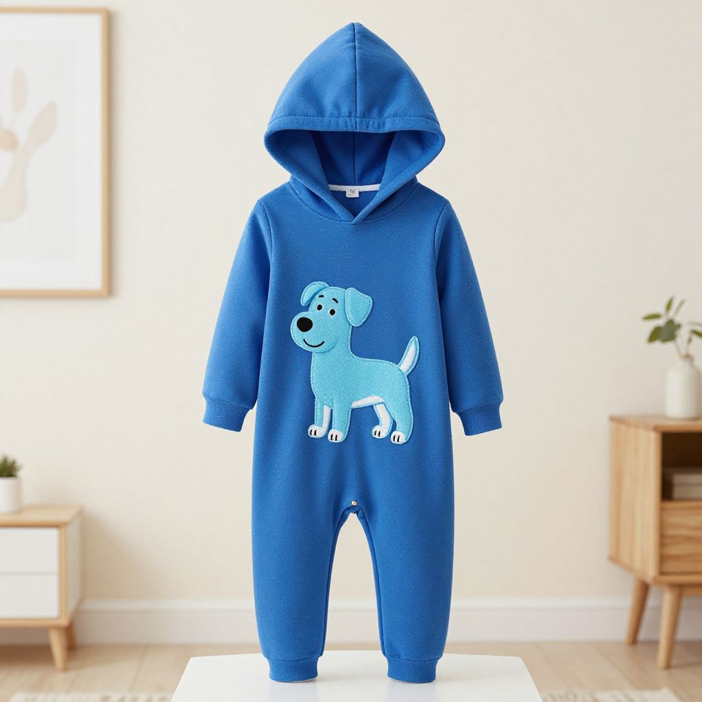 "Youth Onesie Costume, boy in a blue hoodie with a blue dog on it"