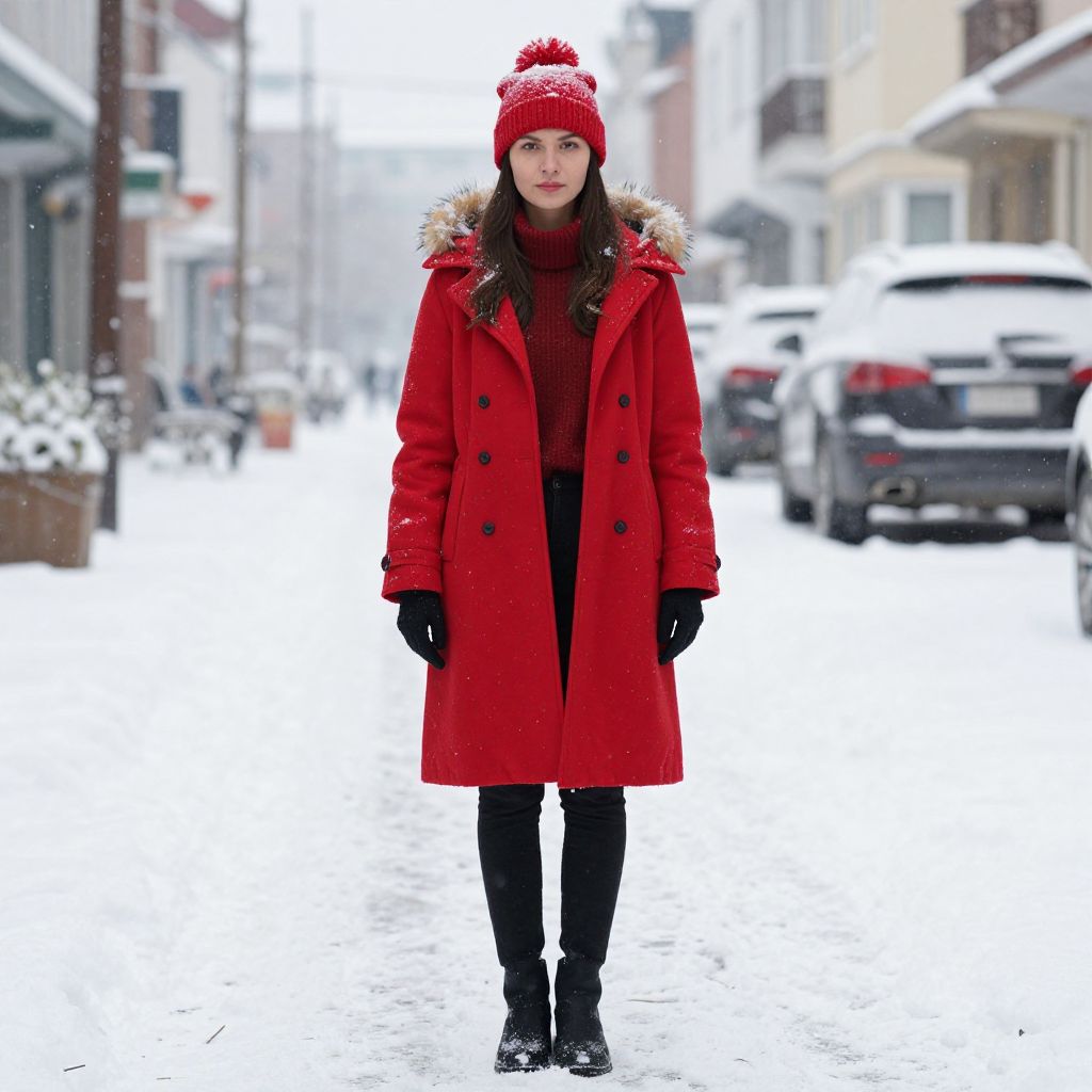 Photograph of a young woman in a bright red coat, black gloves, and boots, standing in a snowy urban street. She wears a red knit