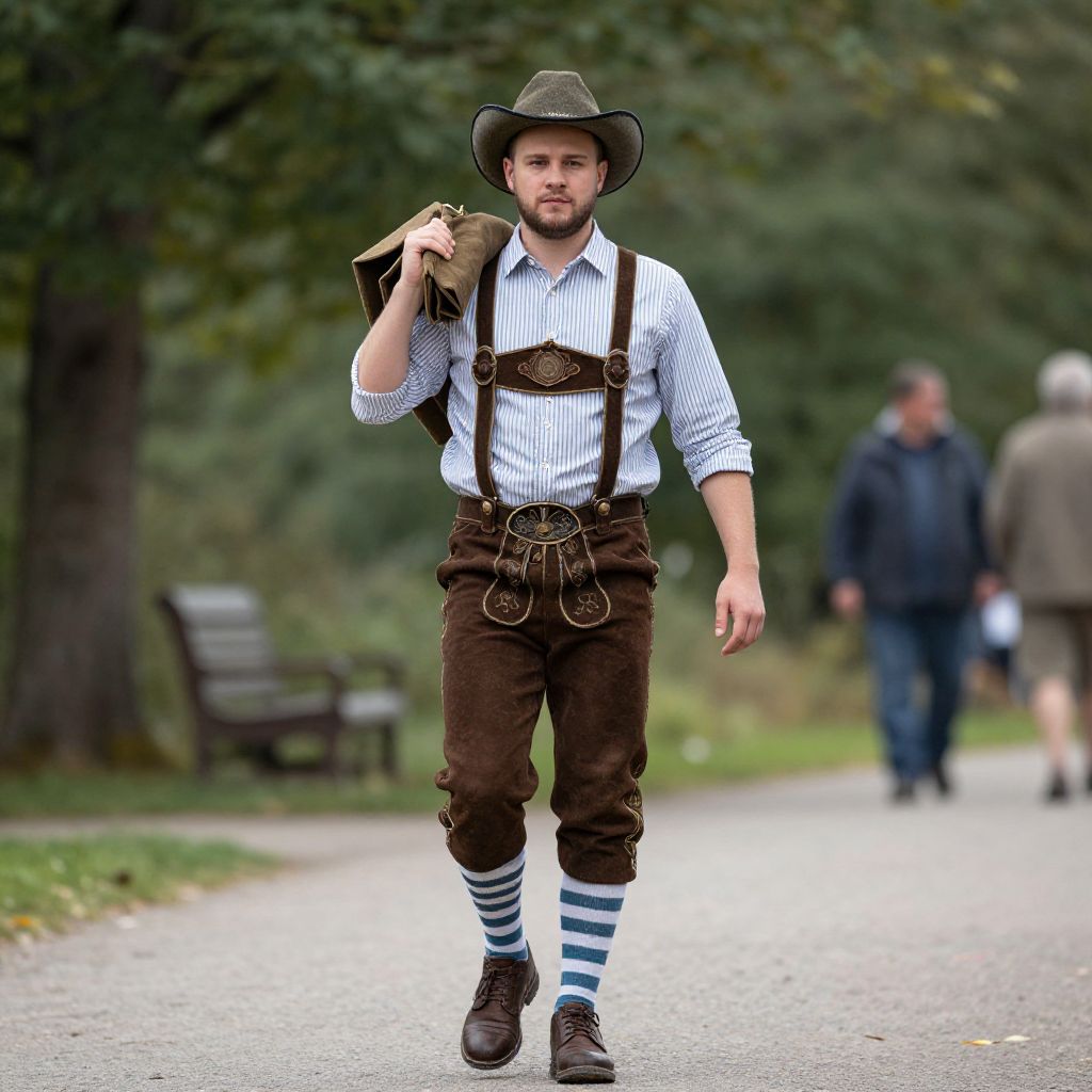 Carry bavarian costume, 1boy, male focus, outdoors, shirt, hat, solo, facial hair, blurry, blurry background, pants, brown footwear, full body, striped clothes, standing, socks, striped socks, tree, collared shirt, day, looking at viewer, cowboy hat, beard, belt