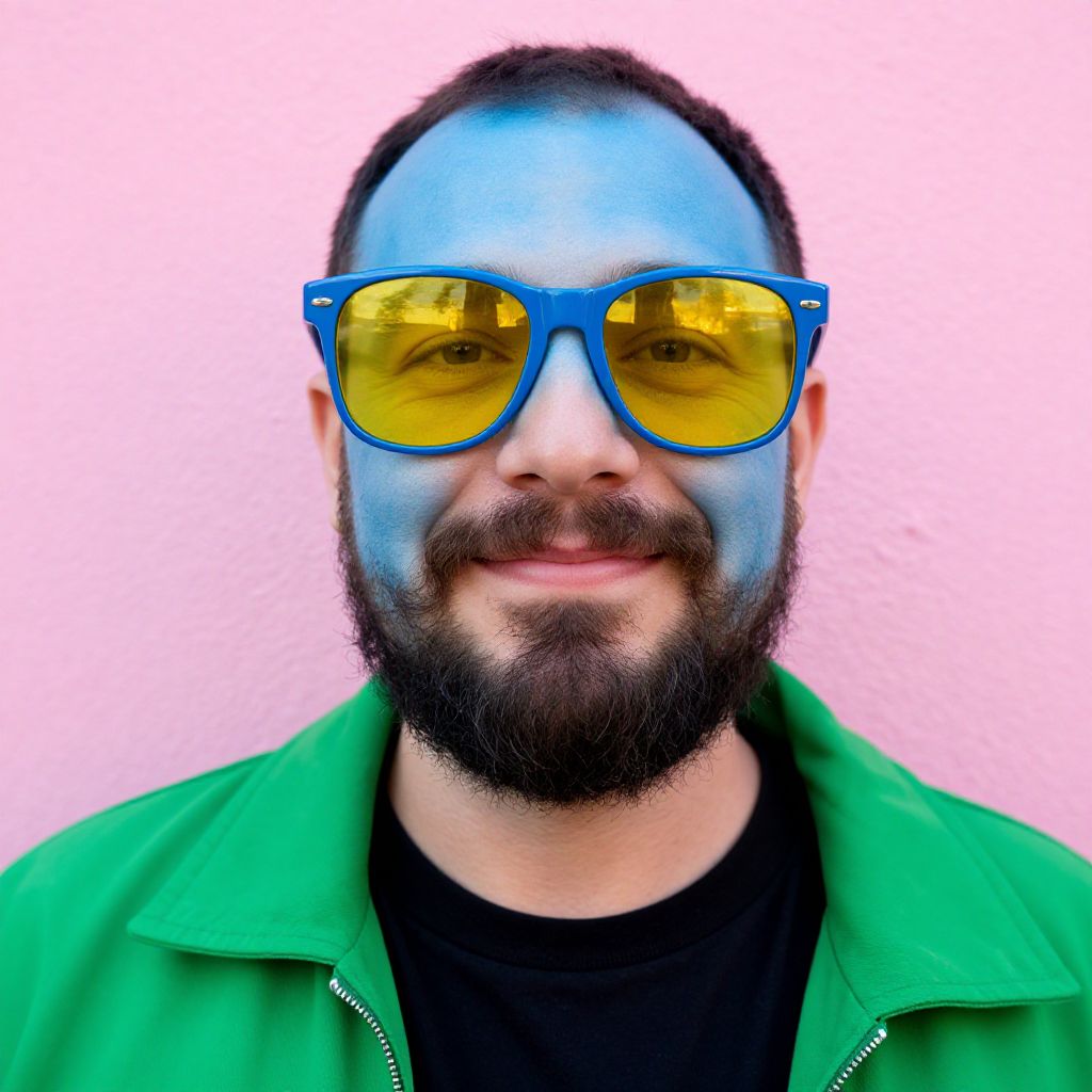 Mustache photo of a playful young man with a vibrant, dyed blue mustache, casual modern clothing, urban graffiti wall background, lively and energetic mood, bright natural lighting, high saturation colors, street style photography vibe