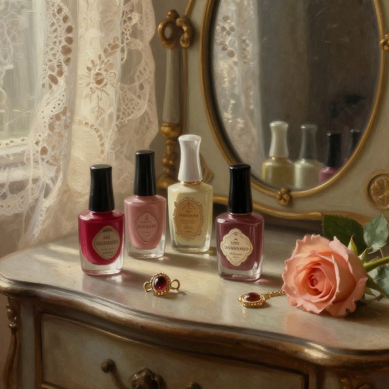 Vintage-style still life scene showcasing classic glass nagellack bottles with ornate labels, gentle sunlight streaming through lace curtains, antique vanity table with delicate jewelry and fresh roses, warm muted tones, oil painting effect with rich textures.