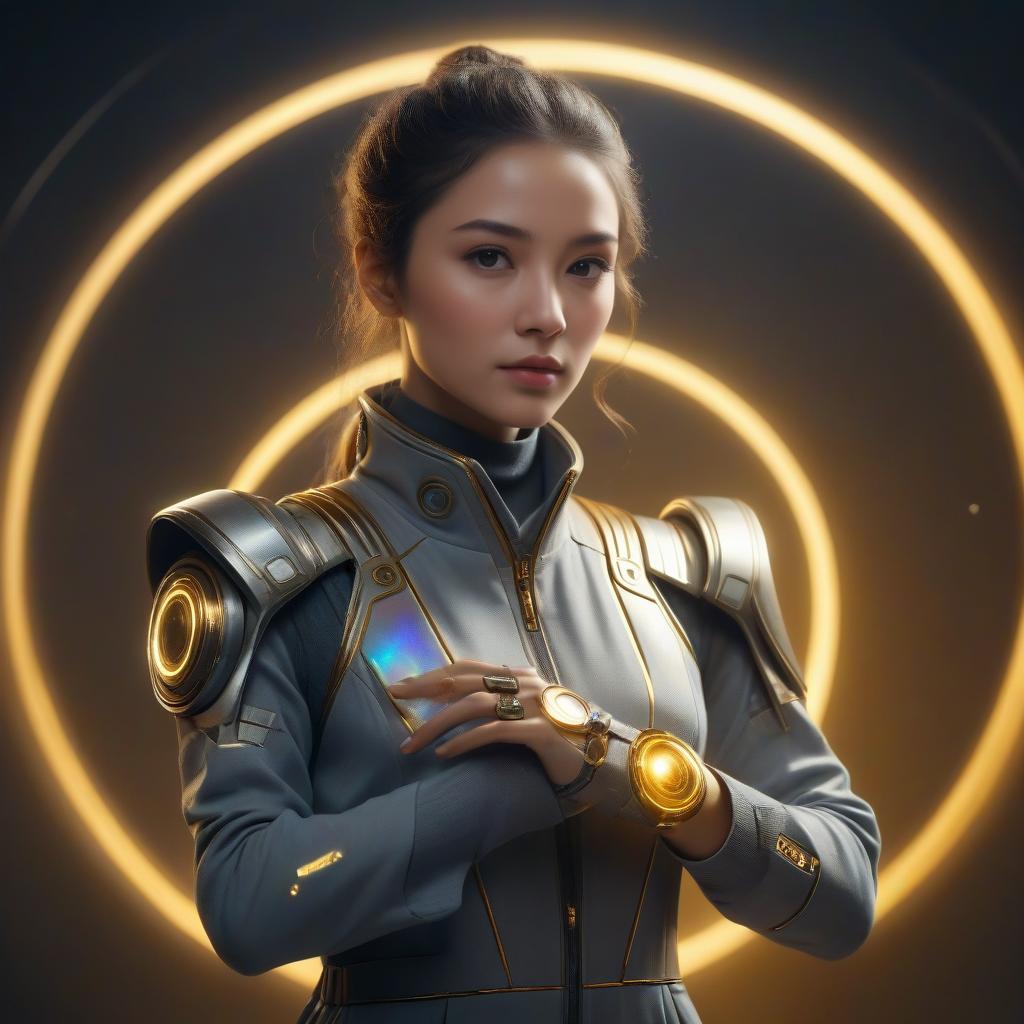 Portrait of a confident young woman in a silver futuristic outfit holding a glowing circular holographic device. She is set against a background featuring concentric golden illuminated rings, suggesting advanced technology or sci-fi themes. The woman has smooth skin, curly hair tied back with a metallic headband, and a focused expression.