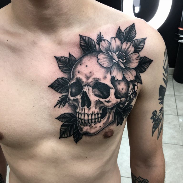 Photograph of a shirtless person with a large, detailed black and gray tattoo on their upper chest and shoulder. The tattoo features a skull with a heart-shaped nose and is surrounded by blooming flowers and dark leaves. Additional smaller tattoos are visible on the person's arm and shoulder. The background shows a tiled floor and a bright light source from the top right.