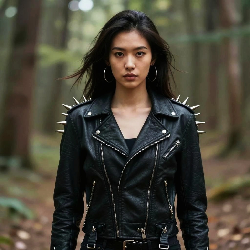 Portrait of a confident Asian woman standing in a forest wearing a black leather jacket with large sharp spikes on the shoulders. She has long dark hair flowing naturally and wears hoop earrings. The background is blurred, emphasizing her edgy and rebellious style.