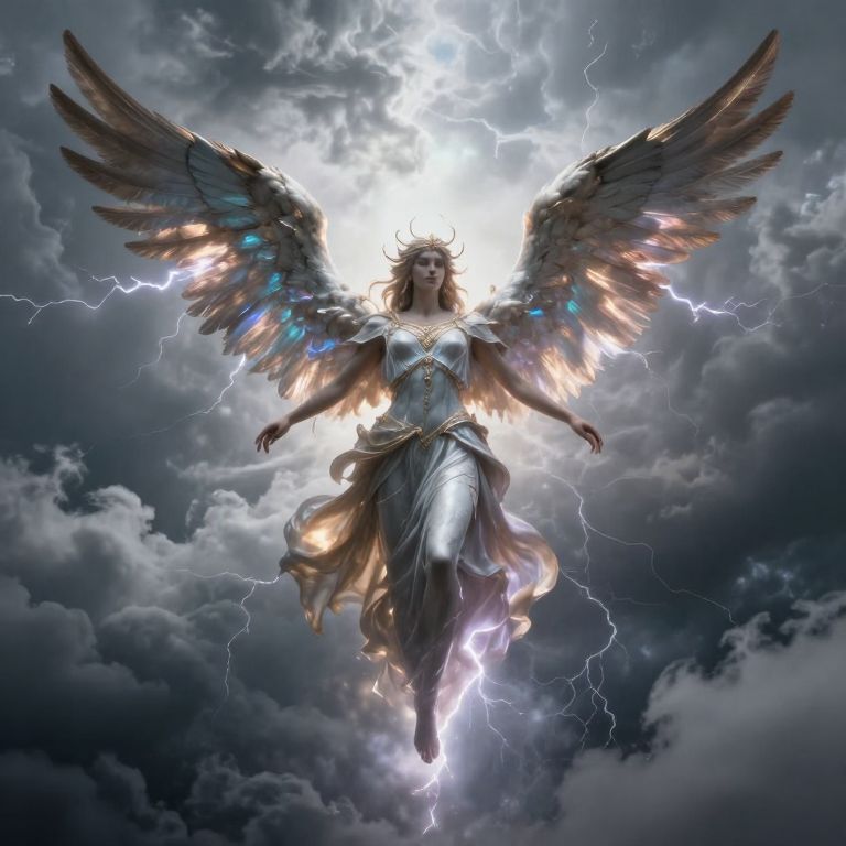 Real.angels descending from stormy skies, powerful and awe-inspiring, radiant figures with intricate, iridescent wings, lightning subtly illuminating their forms, dynamic clouds swirling, dramatic lighting, a blend of fantasy and hyperrealism capturing divine intervention