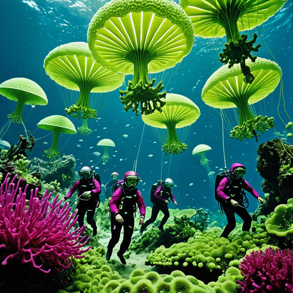Incomparable a group of ocean thrill seekers are near many green fungus plants, in the style of Otto Piene, intricate underwater worlds, elaborate spacecrafts, magenta and lime green, detailed costumes.