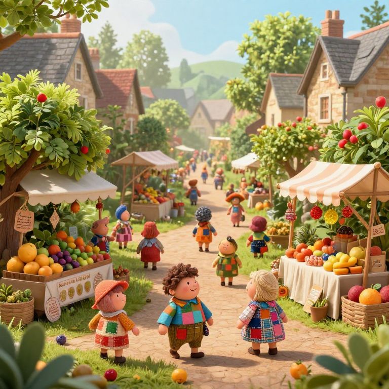 This vibrant CGI image depicts a sunny, bustling village market. Colorful wooden stalls line a cobblestone pathway, laden with fruits, vegetables, and handmade crafts. Toy-like, anthropomorphic characters with varied hairstyles and outfits, including a girl in a pink hat and red dress, a curly-haired boy in a blue shirt, and a blonde girl in a plaid coat, walk and chat among the stalls. Trees with lush green foliage and red fruits flank the path, while charming cottages with gray roofs and brick chimneys are visible in the background. The bright, cheerful scene is bathed in warm sunlight, enhancing the lively, whimsical atmosphere.