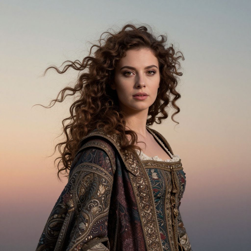 Photograph of a young woman with long, voluminous, curly brown hair against a gradient sky from pink to blue. She has a fair complexion and a serious expression. She wears an elaborate, medieval-style dress with intricate gold and brown embroidery on dark, patterned fabric. Her dress has a square neckline and long, flowing sleeves. The background is a soft, pastel-colored sky, enhancing the vintage, ethereal feel of the image. Her gaze is directed slightly to the right, adding a sense of depth and contemplation. The lighting is soft and even, highlighting the textures of her dress and hair.