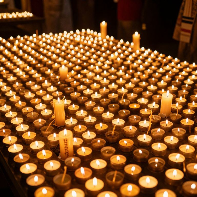 A sea of flickering prayer candles bathes the sacred space in a warm, golden glow, evoking a profound sense of reverence and collective hope, while the soft crackle of wax and the faint scent of incense linger in the air, inviting contemplation and connection to something greater.