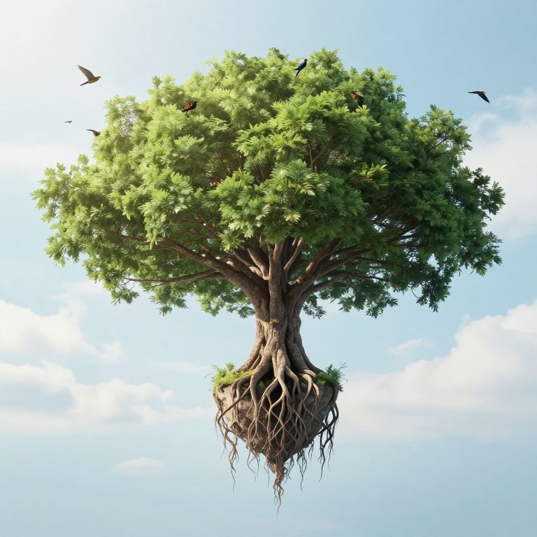 Photorealistic digital artwork of a floating clock sphere set against a bright, partly cloudy sky. The clock sphere is composed of large, interconnected brass gears and surrounded by lush green foliage. The clock face, centered, features black Roman numerals on a white background with black hands pointing to 10:10. The sphere is anchored by a thick, brown tree trunk extending downward. Small green leaves and gears are scattered around, adding dynamic movement. The overall style blends steampunk and nature, with a whimsical, surreal atmosphere.