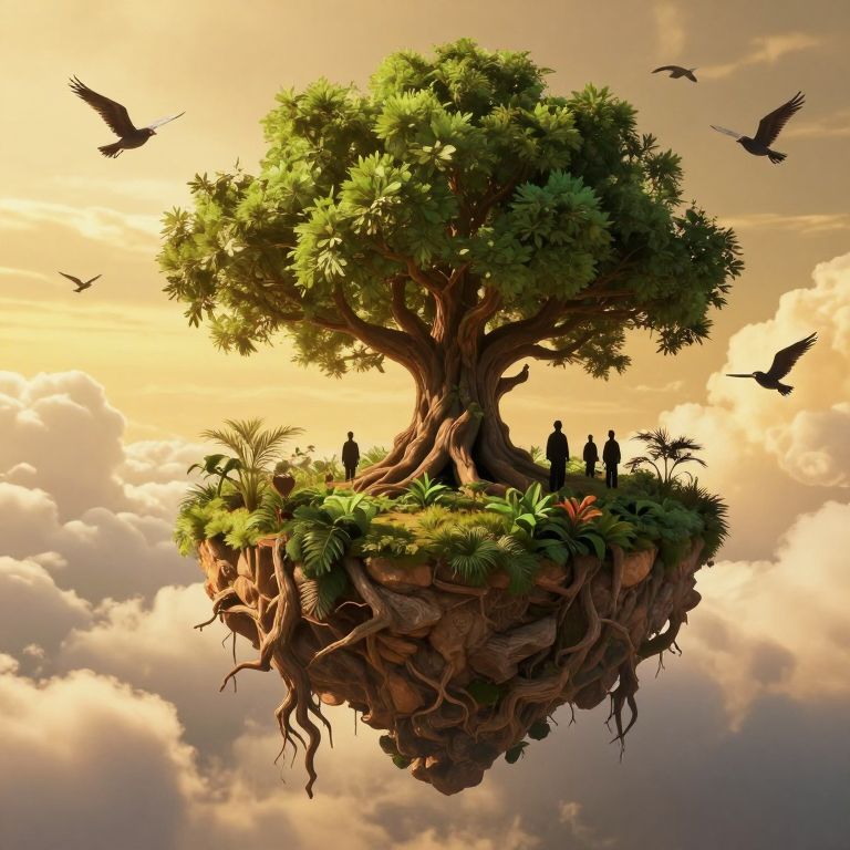 Beneath a sky of floating clock gears, trees grow upside-down, their roots ascending into the clouds while leaves fall upward.