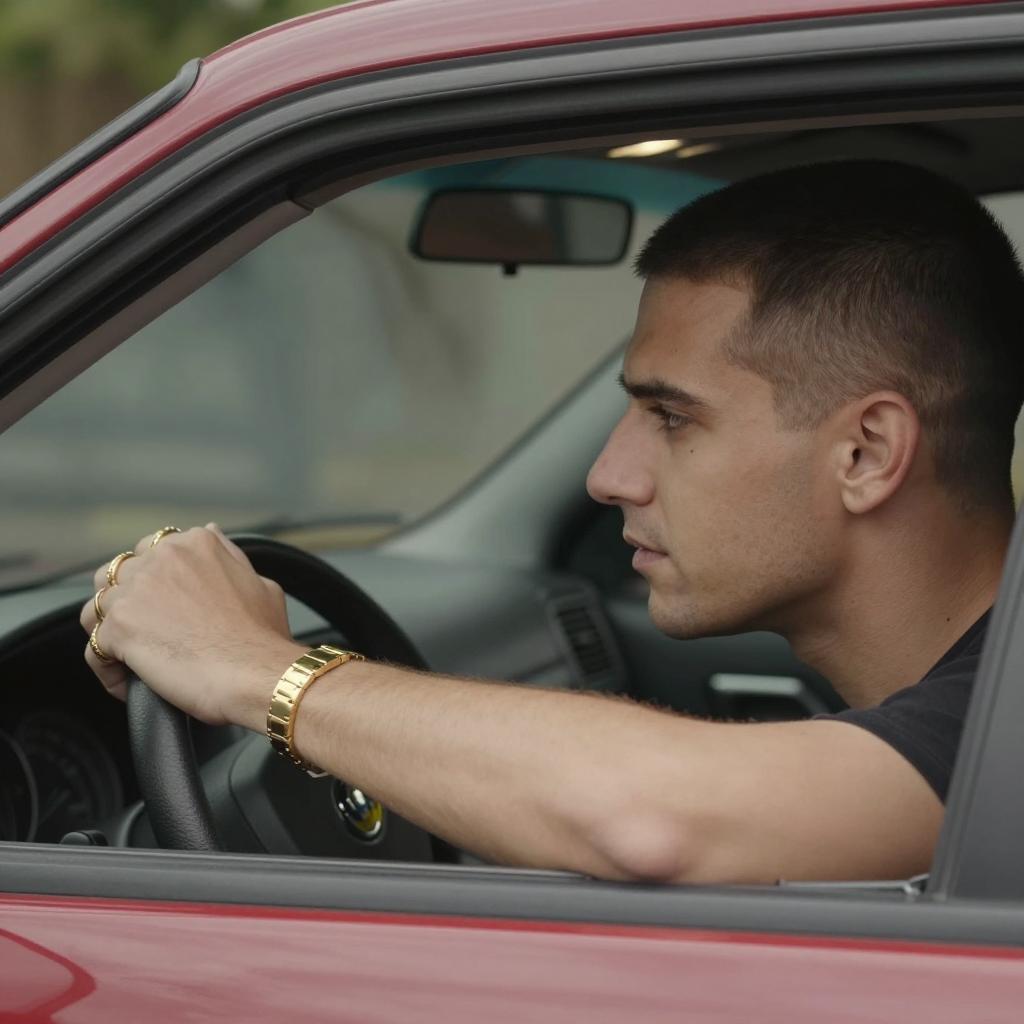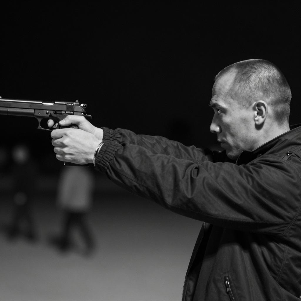 Black-and-white photo of a young man with a shaved head, serious and intense facial expression, aiming a handgun towards the camera. He is wearing a zipped black leather jacket and a dark shirt underneath. The background is blurred with bright lights and faint outlines of a building and a car at night.