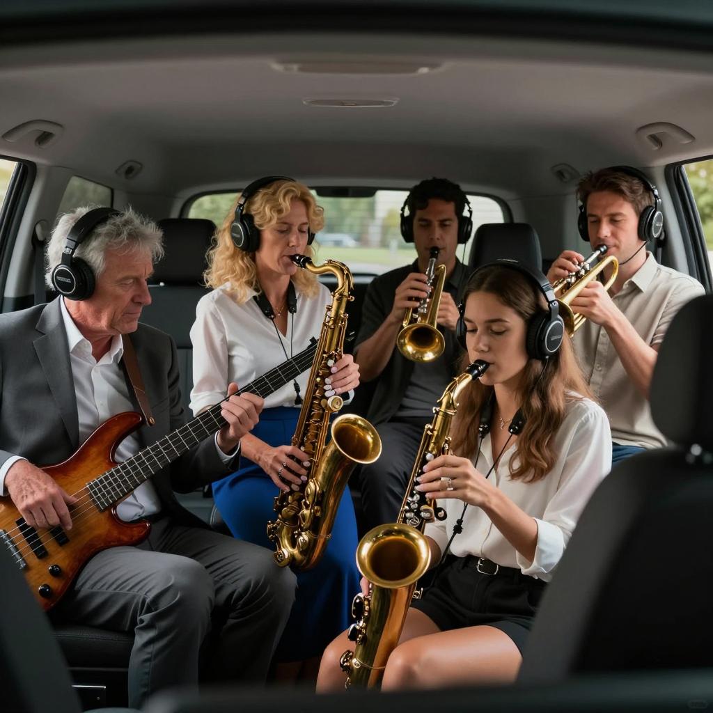 Five musicians playing instruments inside a car. A middle-aged man with gray hair in a gray suit plays a bass guitar. A blonde woman with curly hair in a white blouse and blue skirt plays a saxophone. A young woman with long brown hair in a white blouse plays a clarinet. A man with dark hair in a beige shirt plays a trumpet. The car's interior is dimly lit, with visible seats and door frames. Each musician wears headphones. The saxophonist and trumpet player stand, while the clarinetist and bass guitarist sit.