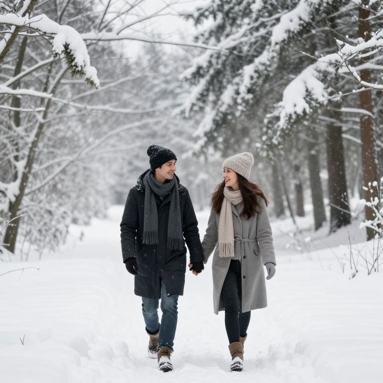 In the quiet embrace of a winter wonderland, two souls walk hand-in-hand, their laughter echoing softly amidst the snow-laden trees, symbolizing the warmth of love that transcends the chill of the season.