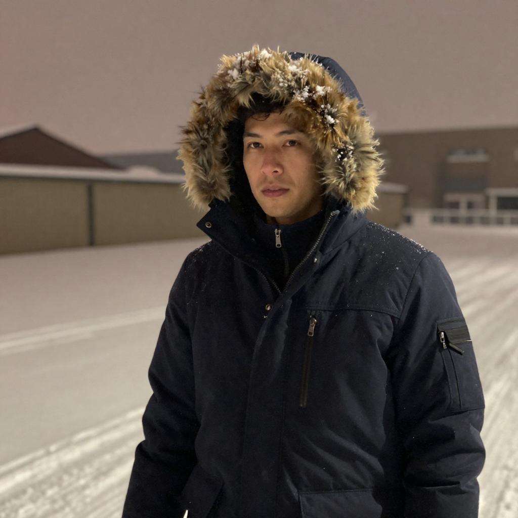Photograph of a man in a dark blue winter coat with a fur-lined hood, standing in a snowy night scene. Bright light from behind illuminates his face. Snow-covered ground in the background. One person, intense expression.