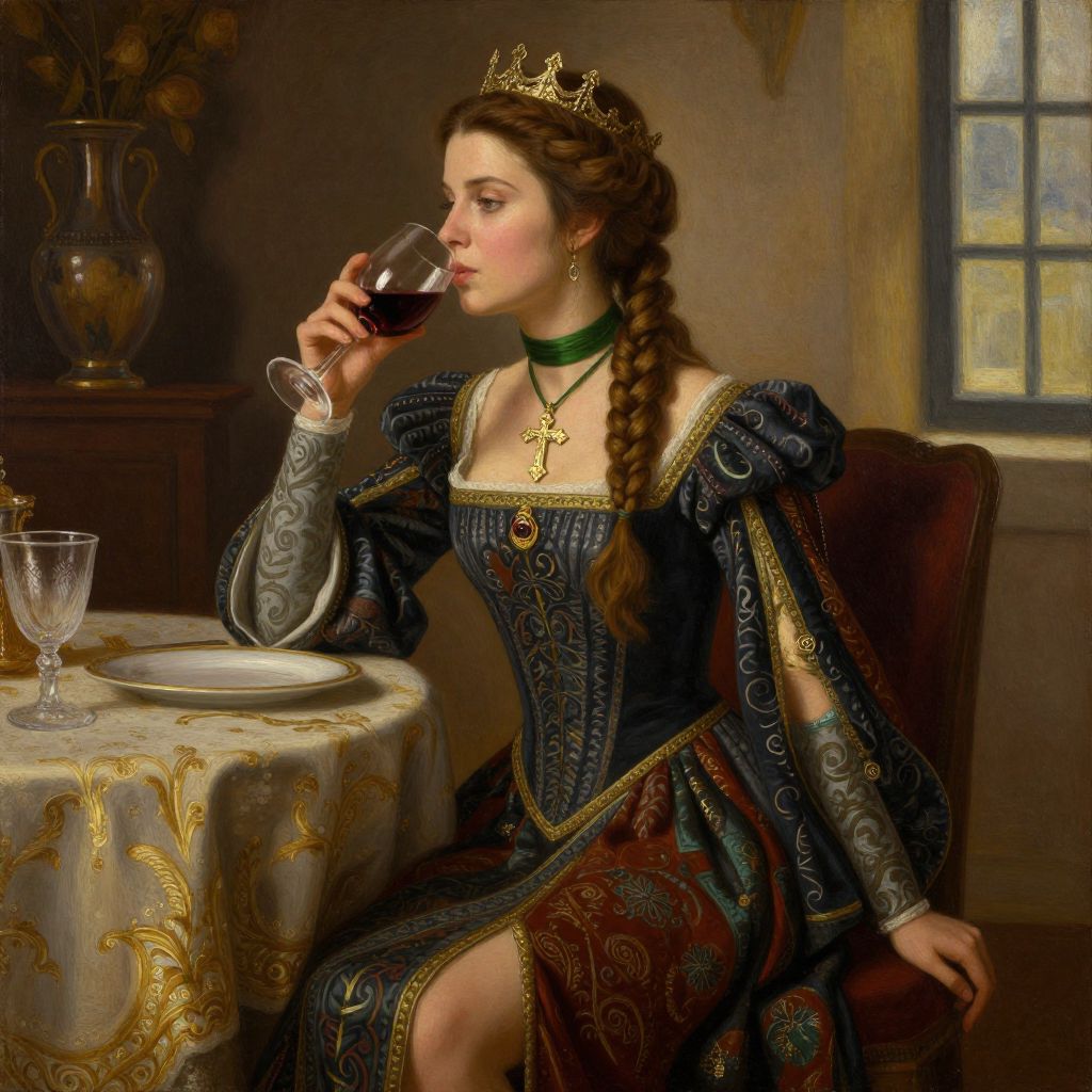 Photorealistic painting of a crowned woman in medieval dress, sipping wine, seated at an ornate table, braid, gold jewelry, dim