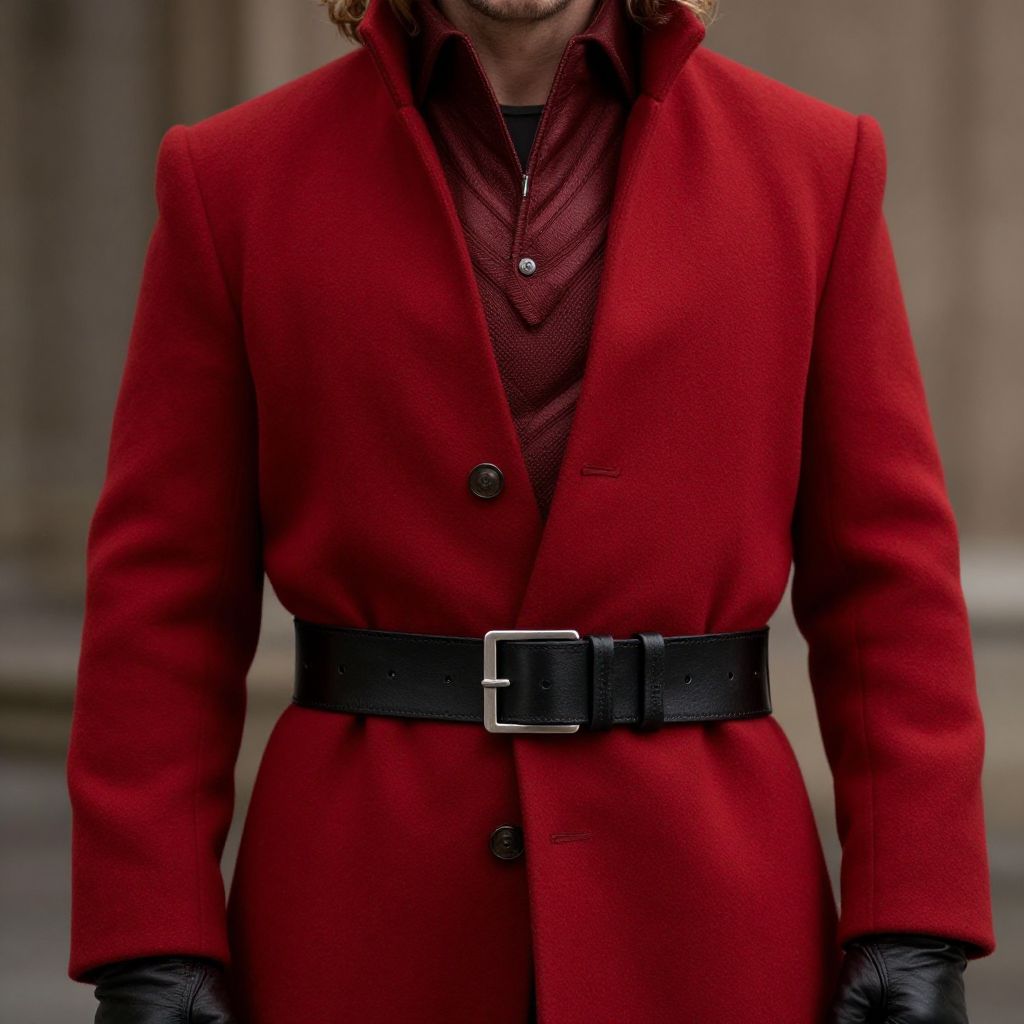 "Tyrion Lannister Cosplay, man in a red coat and black leather belt"