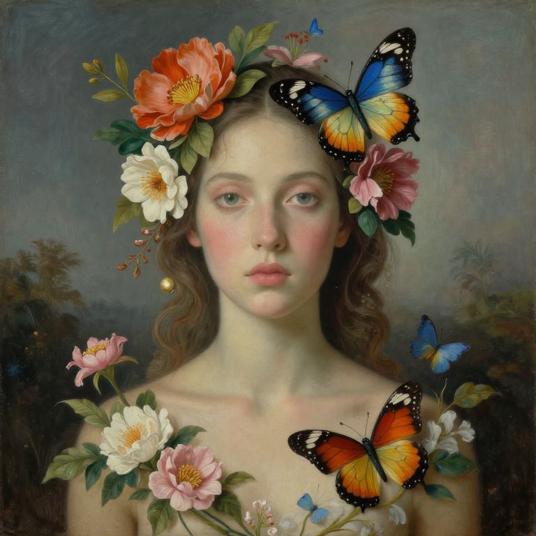 A surreal, ethereal figure adorned with floral and butterfly motifs, evoking the artistic styles of Oswaldo Guayasamin, Robert Rauschenberg, David Hockney, and J.C. Leyendecker.