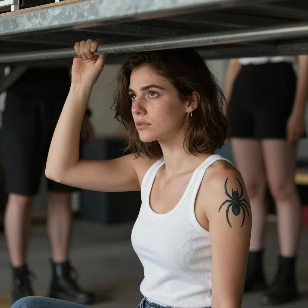 Black and white photograph of a woman with long hair, wearing dark shirt and denim overalls, standing in front of a wall displaying movie posters. "BRAND NEW MOVIES!!" sign with arrows above her head. Shelves with various movie posters on both sides. Woman's hands on hips, slightly tilted head. Upper left corner shows part of another poster. Upper right corner has a partially visible shelf with objects.