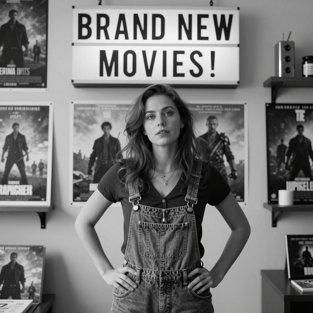 Black and white photo of a young woman with long hair wearing a dark shirt and denim overalls, standing with hands on hips in front of a wall covered with movie posters. A lightbox above her reads 'BRAND NEW MOVIES!' Shelves with additional posters and items are visible around her.