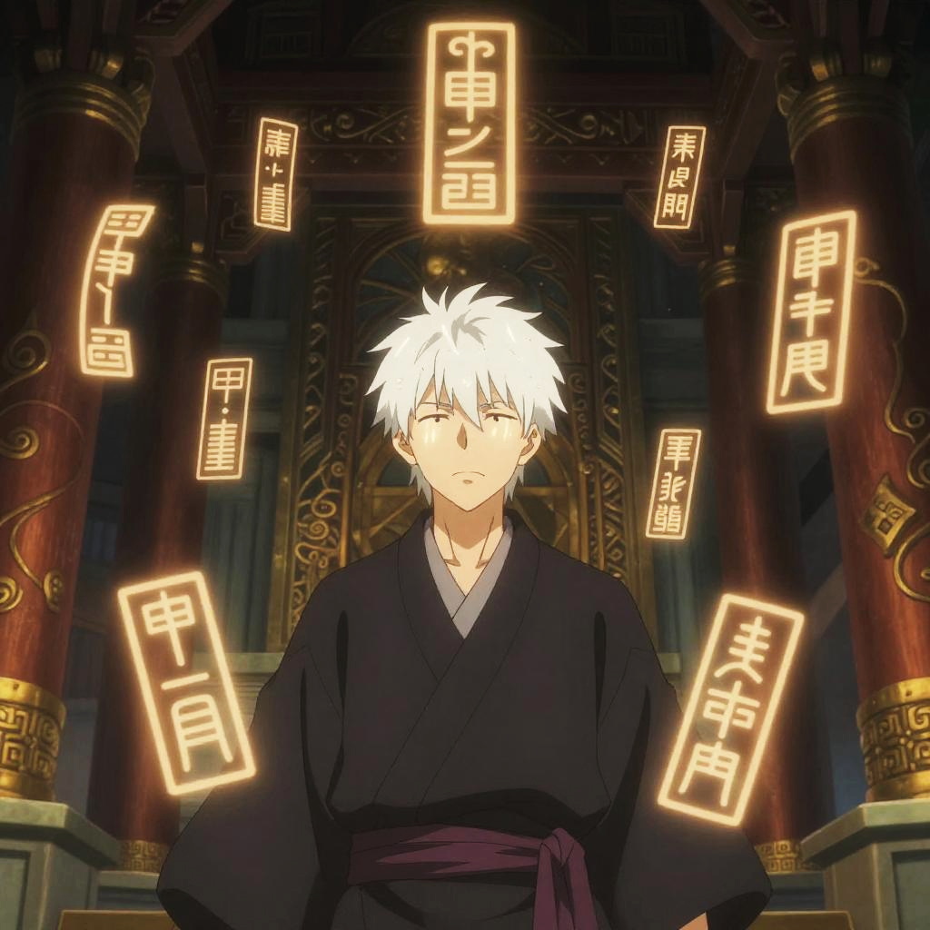Anime with guy with white hair surrounded by floating magical runes in an ancient temple, glowing symbols illuminating his face, mystical and mysterious atmosphere, intricate background details, rich colors blending fantasy and anime aesthetics