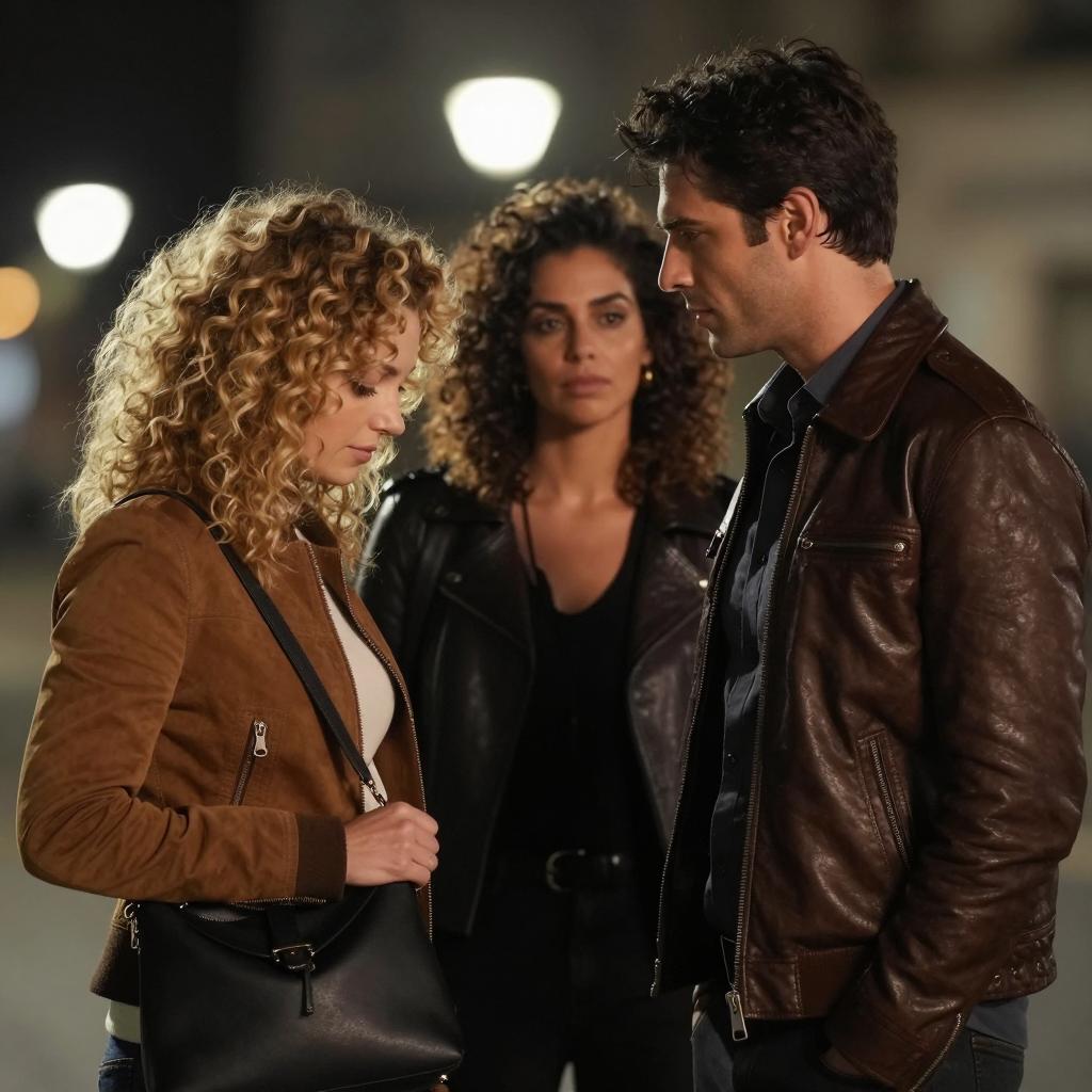 Three people standing indoors. A young girl with curly brown hair, wearing a black witch hat and red cloak, looks up at a blonde woman with long hair, wearing a white sweater and beige cardigan. A man with long dark hair, wearing a brown jacket over a white shirt, stands behind her. The girl leans on a wooden railing. Dimly lit background with blurred windows.