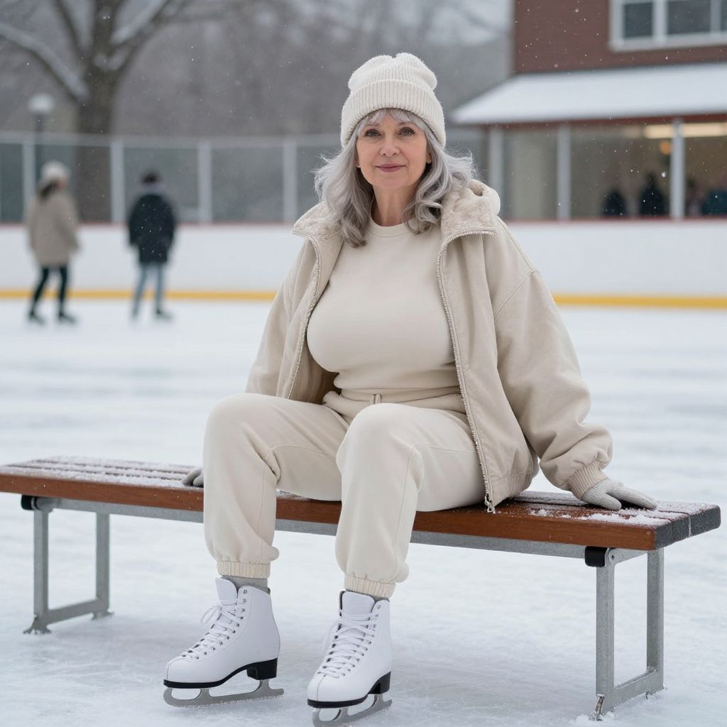 A laid-back ice skating costume with a oversized beige jacket, matching joggers, and a beanie, worn by an older woman with kind eyes, silver hair, and a gentle expression, sitting on a bench at a public skating rink after a long day, warm winter wind with soft snowfall. The woman has big tits and cute face