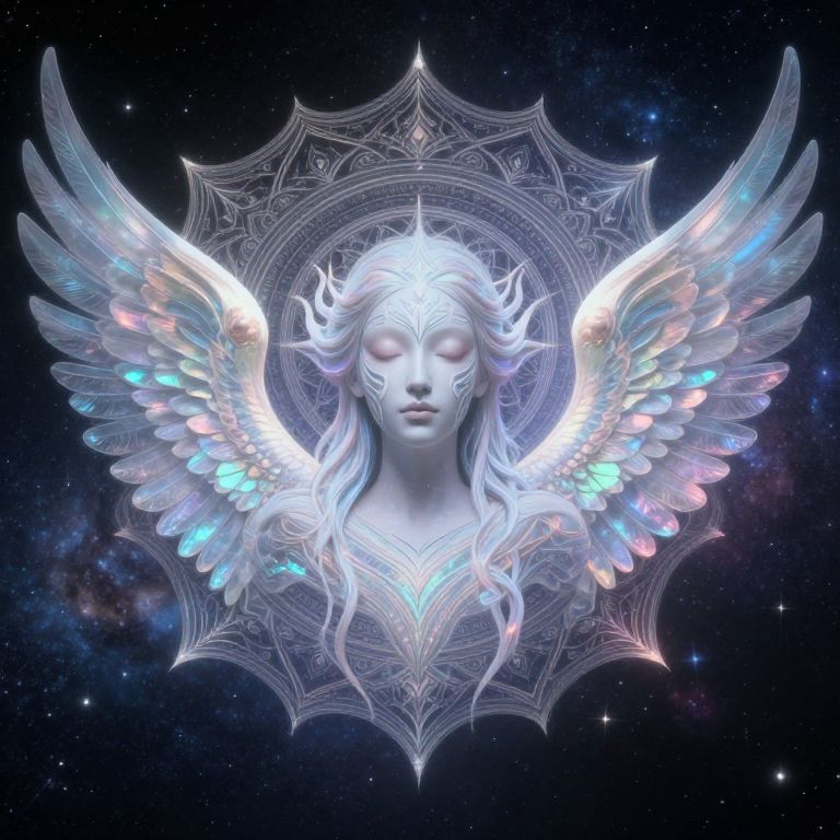 Digital artwork of a glowing, ethereal angelic face with radiant blue and white wings, surrounded by geometric patterns and starry background.