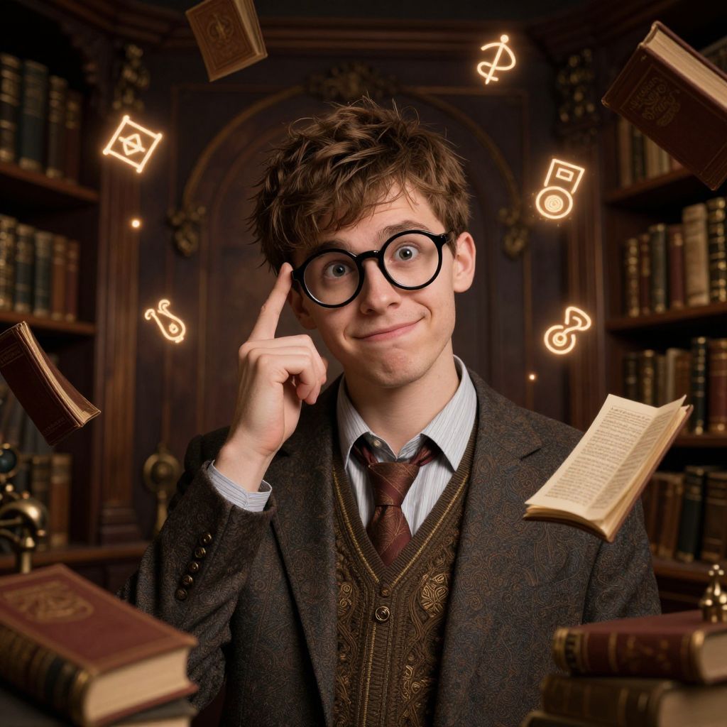 Photograph of a young man with messy brown hair and large, round black-rimmed glasses, smiling and pointing to his head. He wears a dark tweed suit, white shirt, and brown tie. Surrounding him are floating books and musical notes, illuminated in yellow light. The background is a dimly lit, wooden library with shelves filled with books, creating a magical, Harry Potter-like atmosphere. The man's expression and the floating objects suggest a sense of wizardly intelligence and creativity. The lighting highlights his glasses and the books, enhancing the whimsical feel of the scene.
