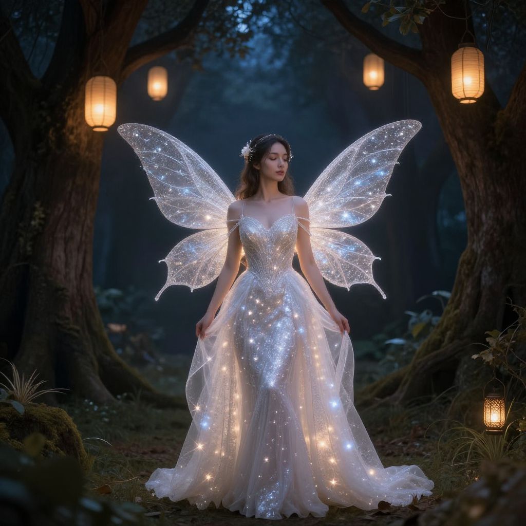 Photograph of a fairy-like woman in a glowing, starlit, white gown with transparent wings, standing in a dark forest illuminated by lanterns.