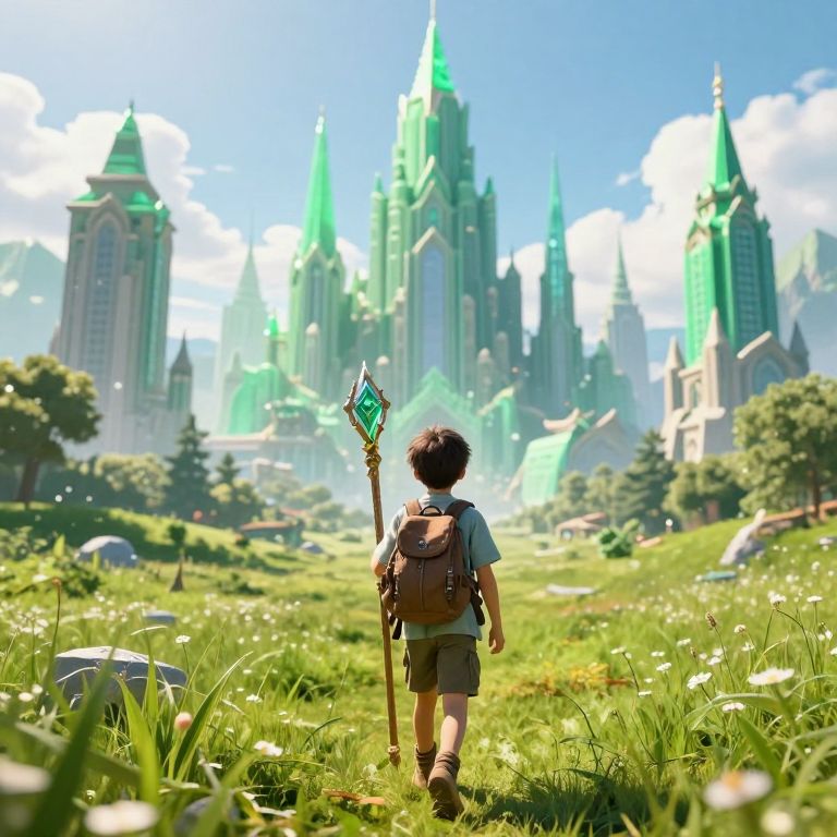 A young adventurer wields a mystical staff as they traverse a sunlit meadow toward an otherworldly city of towering, emerald spires that pierce the heavens, defying the boundaries of reality and imagination.