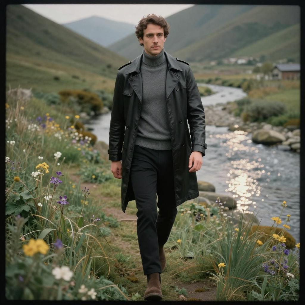 A man, navy blue recycled polyester pullover, charcoal gray hemp trousers, brown leather loafers, smart-casual vibe, rustic log cabin, surrounded by pine trees, crackling fireplace, eastman film stock, relaxed expression, warm ambiance. Man has masculine face and piercing eyes
