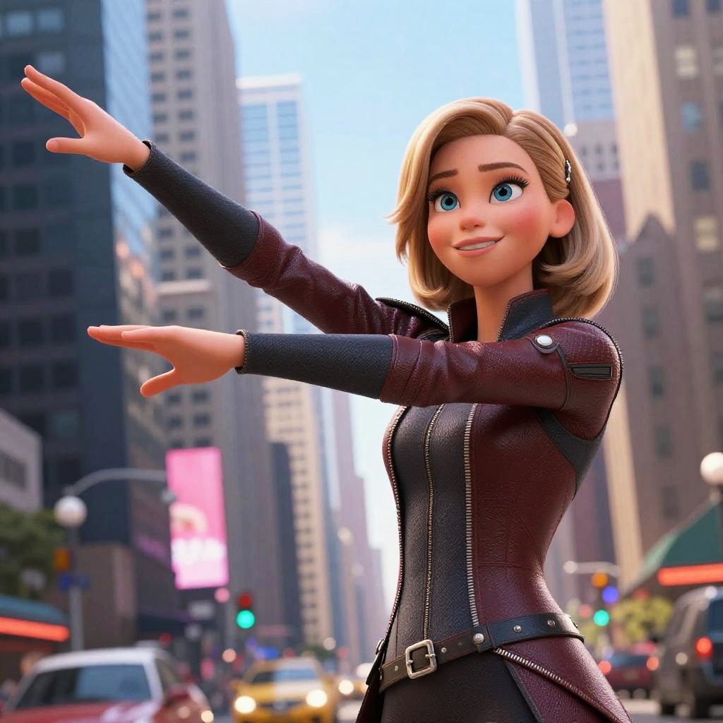 Real life Elastigirl in action, showcasing her elastic powers with elongated arms reaching out, vivid urban background, cinematic angle, ultra detailed costume and face