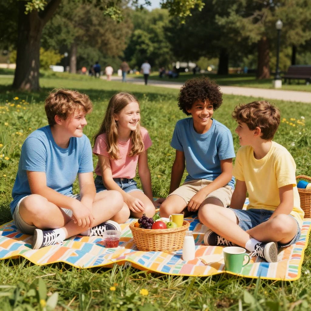 Thick 12 year olds enjoying a summer picnic, bright daylight, joyful faces, casual clothing, lush green grass and colorful picnic blankets, photorealistic style