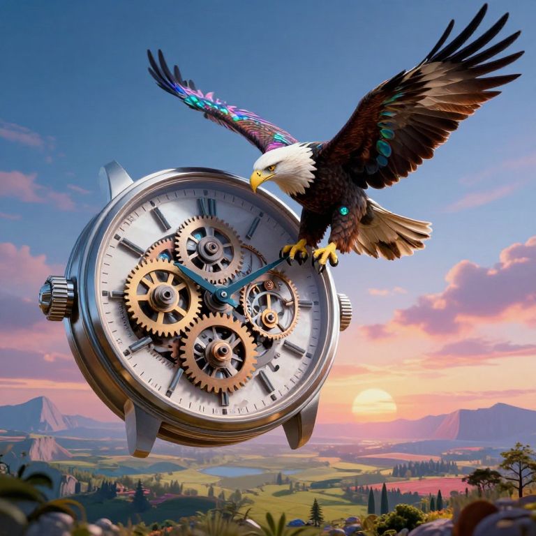 Envision an enchanting fusion of surrealism and digital art technology. At the forefront lies an oversized, exquisitely detailed timepiece, its intricate gears and cogs spinning in slow motion as they float seemingly weightless in midair. Gracefully landing upon one of the watch's hands is a majestic eagle with feathers that shimmer like iridescence. The scene transitions from the surrealism to a high-resolution digital landscape where vibrant colors blend seamlessly, creating an atmosphere that invokes both awe and contemplation. This unique perspective beckons viewers into a dreamlike realm where time appears frozen, while the eagle's piercing gaze directs our attention towards the vast possibilities beyond our reality.