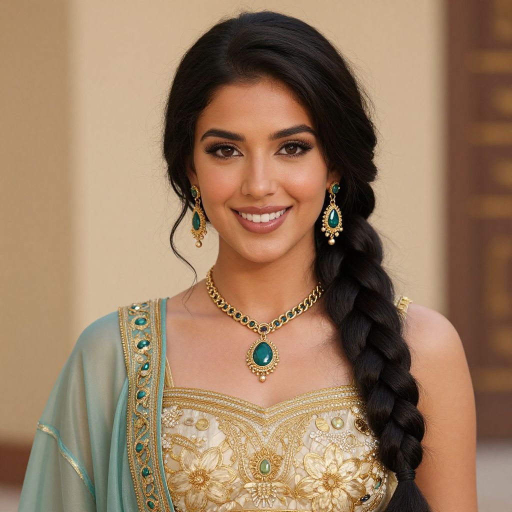 Lady jafar costume, 1girl, solo, jewelry, earrings, necklace, black hair, braid, looking at viewer, long hair, smile