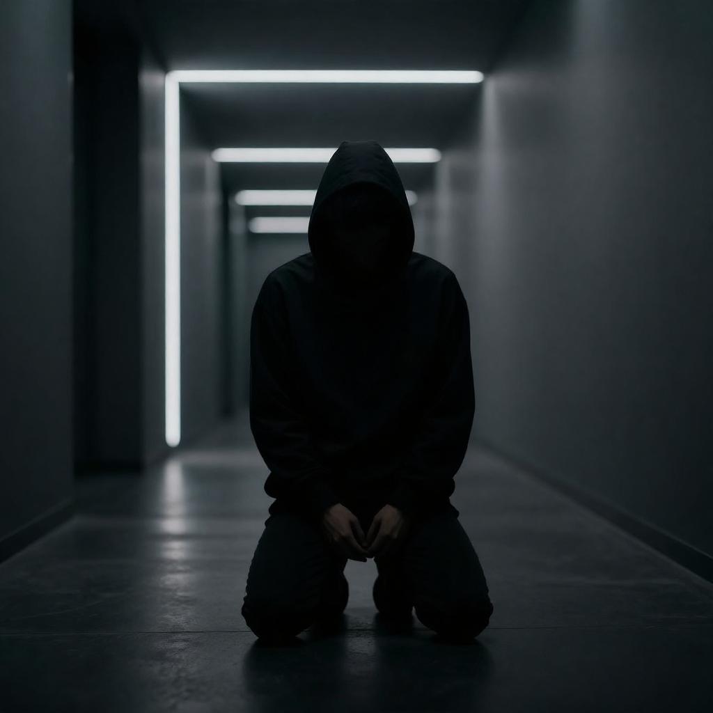 A dark, futuristic hallway with glowing white lights on the walls. A shadowy figure, partially obscured, kneels in the center, facing downward. The scene is dimly lit, emphasizing the contrast between the dark figure and the illuminated background.