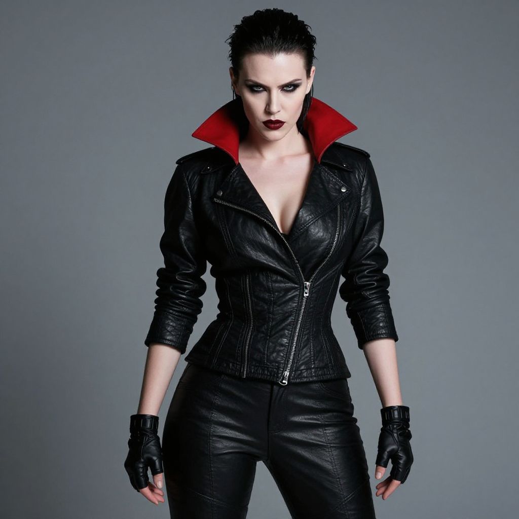 Photograph of a fierce-looking woman with pale skin and dark, slicked-back hair. She's wearing a tight, black leather jacket with a high red collar and a deep V-neck that reveals a hint of cleavage. Her black leather pants are form-fitting, and she has black fingerless gloves. She's standing against a simple gray background, exuding a powerful and edgy vibe. Her dark red lipstick contrasts sharply with her pale skin.