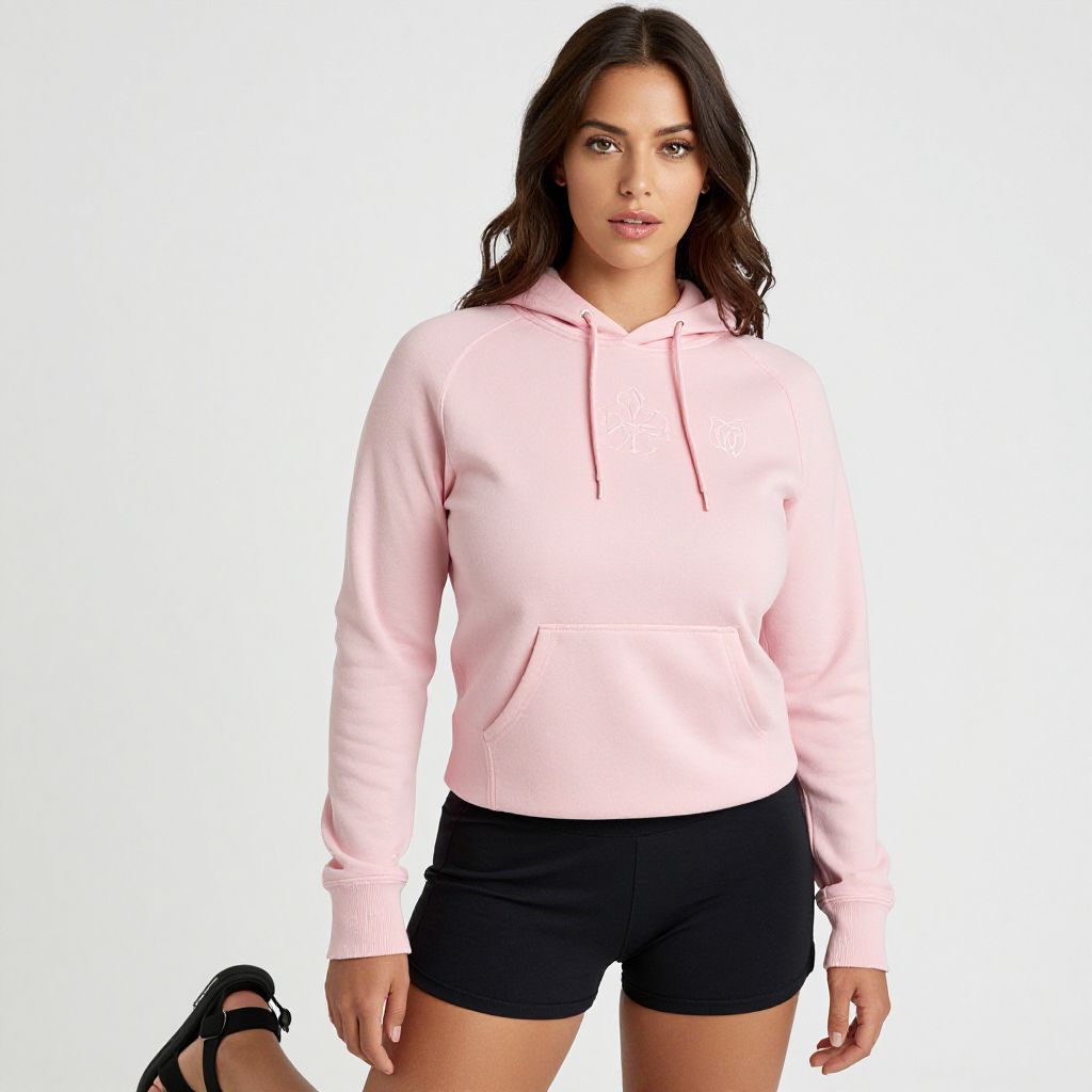 "Woman, casual sporty, pastel pink hoodie with logo embroidery, kangaroo pocket, long sleeves with ribbed cuffs, black fitted athletic shorts, black sporty sandals with straps, white studio background. Sexy. Pretty face and beаutiful eyes. Big breasts."