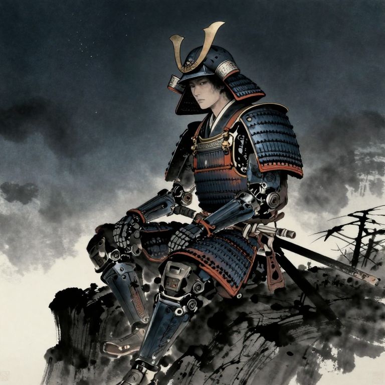 Visualize an exquisite digital art composition reminiscent of intricate Japanese woodblock prints, portraying a tranquil setting where a solitary warrior stands on a foggy precipice overlooking a boundless, colorful sea. The warrior's attire showcases ornate armor with fine gold embellishments and traditional headgear, his expression reflecting both serenity and determination as he looks towards the horizon. This image is rendered from an unusual perspective, granting a close-up view that accentuates the dramatic contrast between the warrior's unwavering stance and the awe-inspiring grandeur of the natural world surrounding him. The artwork conveys a powerful emotional spectrum, ranging from deep tranquility to subtle intensity, capturing both the inner turmoil and external peace of this iconic figure against the backdrop of nature's breathtaking splendor.