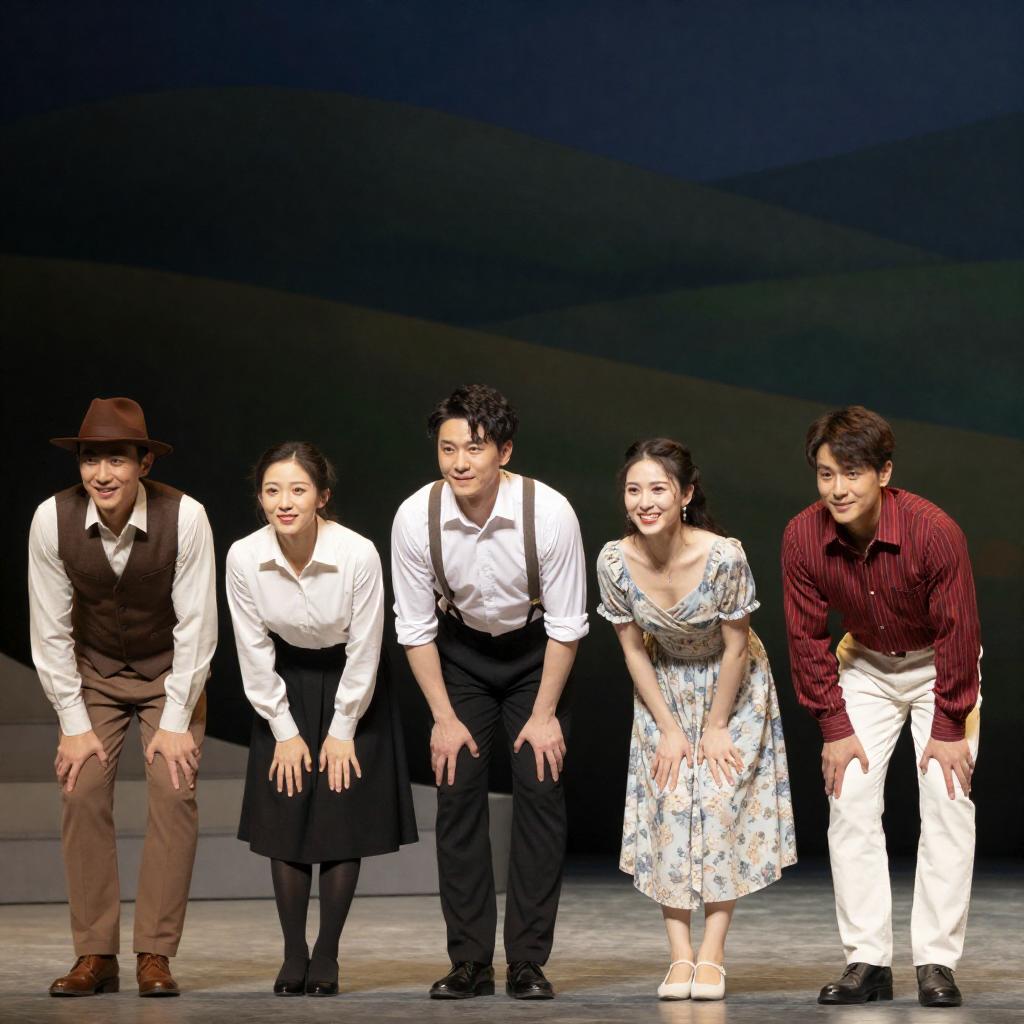 Photograph of a dance performance. Central male dancer in black suit, purple tie, black shoes, mid-movement. Surrounding dancers in colorful 1950s-style dresses and suits. Dark stage, purple and blue lighting, visible stage rigging. Dancers in various poses, some with arms outstretched. Multiple people, focused expressions.