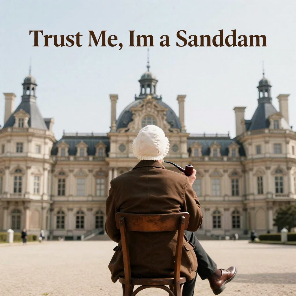 Photograph of a person wearing a white bonnet and brown jacket, sitting on a wooden chair with legs crossed, holding a pipe in the right hand. The person is facing an elaborate baroque-style building with multiple windows and towers under a clear, bright sky. Text above reads 'Trust Me, Im a Sanddam.'