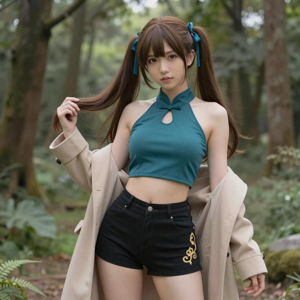 Digital artwork of an anime-style young woman with long brown twin ponytails tied with blue ribbons, wearing a teal halter crop top and high-waisted black shorts with gold embroidery. She is holding a beige coat open while standing in a lush green forest with tall trees and diffused sunlight.