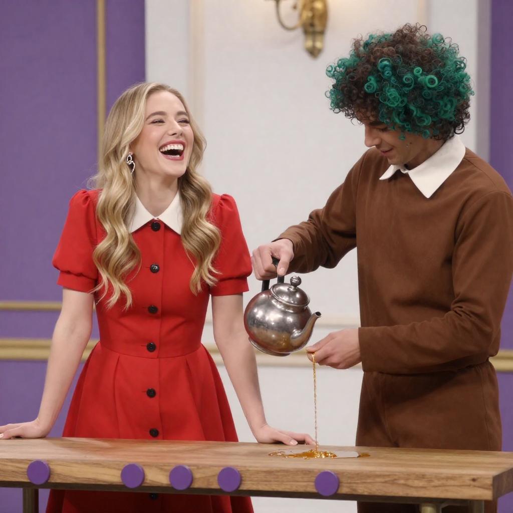 Photograph of a scene with two people. Blonde woman in red dress with black buttons and white collar, laughing, leans on a wooden table with purple rings. Man with green curly hair, brown outfit, white collar, pouring golden liquid from a metallic teapot. Background has purple and white walls with gold decorations.