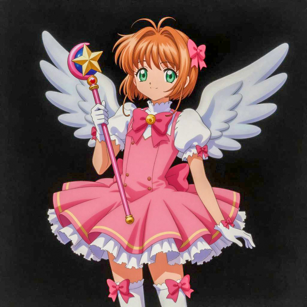Digital illustration of a female anime character with short brown hair, green eyes, and a pink bow. She wears a pink dress with white frills, white gloves, and white thigh-high socks with pink bows. She has white wings and holds a pink wand with a star on top. Black background. She stands with a slight smile, holding the wand up with her right hand.